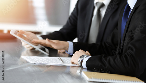 Businessman using tablet computer and work together with his colleague in sunny modern office, close-up. Unknown business people at meeting. Teamwork and partnership concept