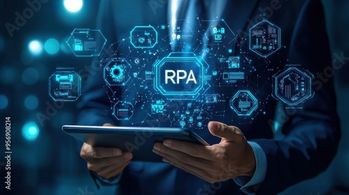 Businessman using tablet to interact with RPA technology, showcasing automation and digital transformation in modern workplaces.