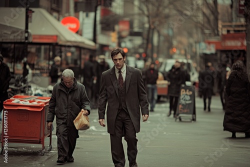 businessman, homeless, man, walking, street, city, urban, poverty, wealth, disparity, contrast, suit, cart, sidewalk, tied-up, people, crowd, society, social, issue, city landscape, business, lifestyle, outdoors, daytime, winter, cold, scene, background, blur, sharpened, perspective, new, york