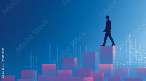 Businessman walking on the podium, blue background with abstract shapes of squares and bar charts