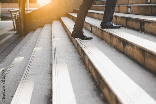 Businessman walking on upstairs taking landscape outdoor shots Unrecognized businessman going to office in the morning in rush hour selective focus Business White collar worker and leadership concept