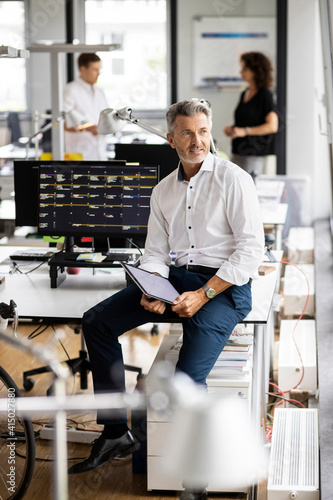 Businessman with digital tablet looking away while sitting on desk with colleague in background at open plan office
