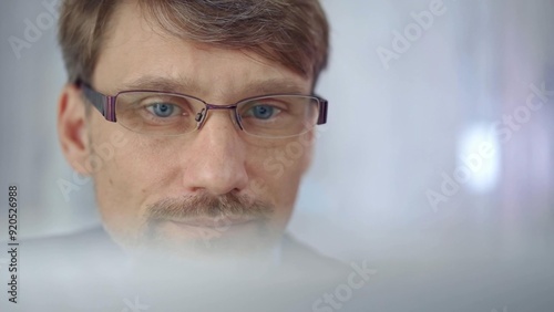 Businessman with glasses looking intently obscured partially by a translucent surface of laptop. Business people concept