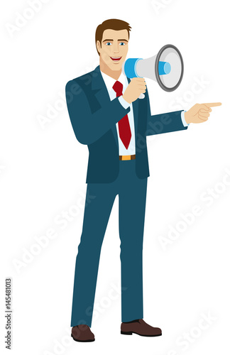 pointing, finger, loudspeaker, sound, megaphone, speaker, bullhorn, message, announcement, talking, shouting, speech, announce, public, flat, business, businessman, white-collar, seller, corporate, manager, professional, adviser, illustration, vector, isolated, people, man, human, person, male, character, adult, clothing, suit, necktie, jacket, standing