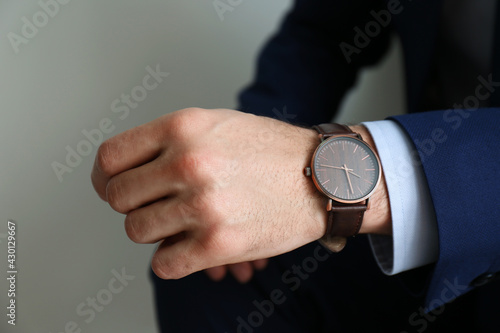 Businessman with luxury wrist watch on grey background, closeup