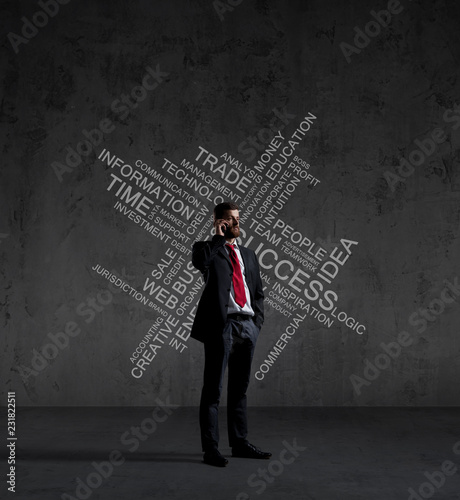 Businessman with smartphone standing over wall with text. Business, success, improvement, concept.