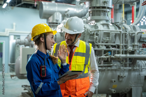 Businessman with technical worker women wearing uniform safety workers checking and working in control room plant at industry factory,Business and industry concept.