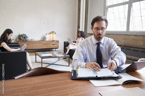 Businessman working at desk, female colleagues in background