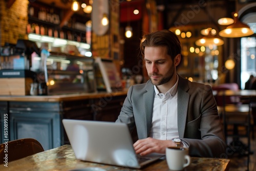 Businessman working on a laptop in a café: A focused businessman working on his laptop in a stylish café.