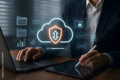 Businessman working on secure cloud computing interface with data protection icons and cloud upload symbol representing cybersecurity and online file storage safety