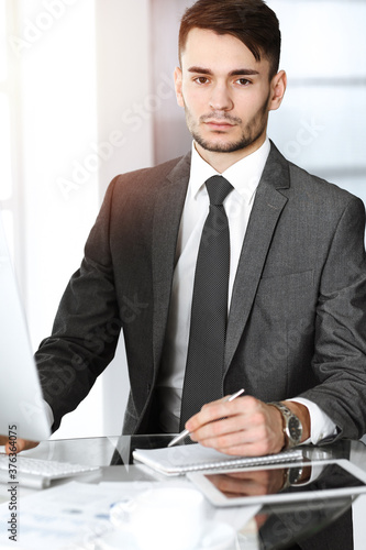Businessman working with computer in sunny office. Headshot of male entrepreneur at workplace. Business concept