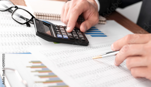 Businessman working with using a calculator to calculate the numbers. Finance accounting concept