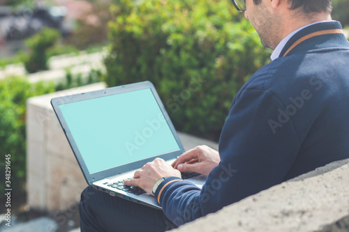 businessman works with computer in the park