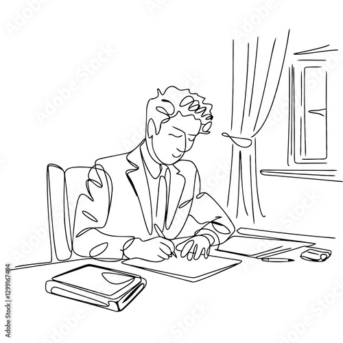businessman, writing, desk, line art, minimalist, illustration, work, office, professional, suit, paper, pen, sharpened, concentration, job, design, creativity, drawing, monochrome, outline, workplace, productivity, business, corporate, formal, vignetting, character, figure, study, window, curtain