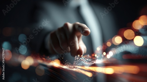 finger, pointing, hand, businessman, suit, dark, light, bokeh, abstract, futuristic, technology, connection, network, digital, datum, communication, concept, innovation, future, modern, business, success, vision, idea, direction, leadership, decision, choice, sharpened, detail, closeup, macro, glow, bright, orange, yellow, white, blue, black, background, blurred, motion, energy, stream, line, dot, particle