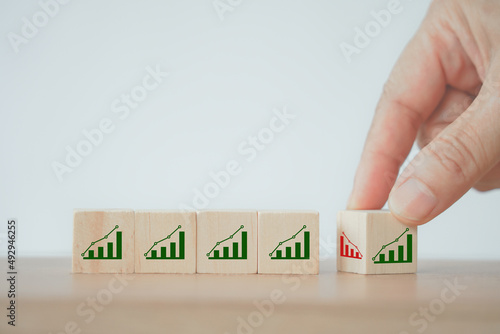 businessman's hand flipped decreasing graph to increasing graph icon on wooden cube block for development, growing business or income concept