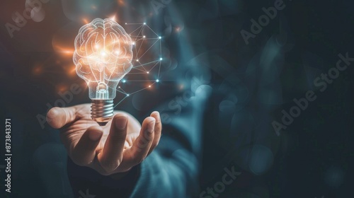 Businessman's hand holding a light bulb and connection path to intelligent thinking