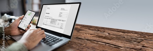 Businessman's Hands Working On Invoice On Laptop