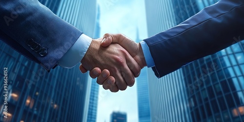 Businessmen handshake on skyscraper background. Partnership, successful deal, agreement, business contract concept