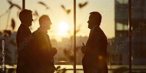 Businessmen silhouettes talking and laughing in warm backlight, investors, office place, estate