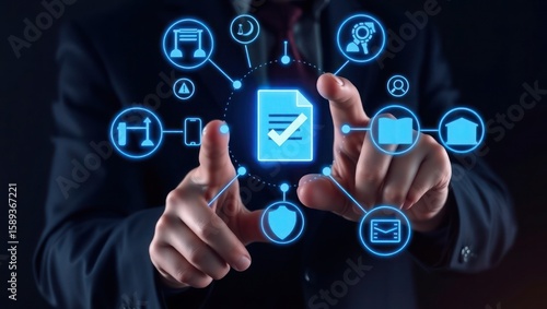 Businessperson digitally interacts with a verified document, surrounded by interconnected digital icons representing various business processes and security.
