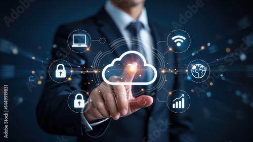 businessperson, technology, cloud, storage, system, datum, security, cyberspace, network, digital, interface, touch, finger, hand, icon, symbol, graphic, modern, illustration, light, dark, background, image, business, man, suit, software, connectivity, virtual, information, global, growth, analysis, progress, secure, access, control, efficient, systematic, innovation, businessman, pointing