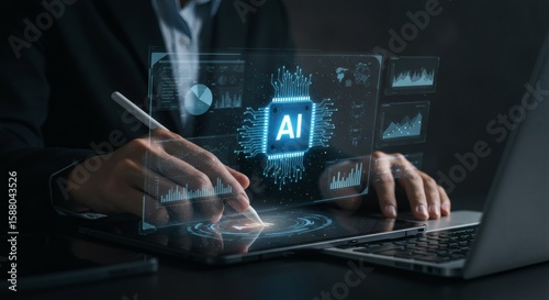 ai, artificial, intelligence, technology, business, datum, digital, futuristic, innovation, interface, holographic, tablet, stylus, computer, laptop, screen, chart, graph, information, progress, development, future, modern, network, system, concept, solution, strategy, planning, research, science, growth, efficiency, automation, learning, machine, algorithm, software, application, design, user, hand, person, working, office, dark, businessman, work
