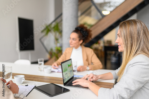 Businesswoman analyzing financial data and performance over laptop while working together in board room