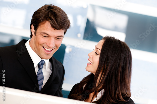 businessman, businesswoman, businessperson, computer, office, man, woman, brunette, caucasian, indoor, male, manager, smiling, working, arms crossed, blue, business, business attire, businessperson, business suit, co-worker, laughing, people, professional, sale, salesperson, salesgirl, suit, talking, two people