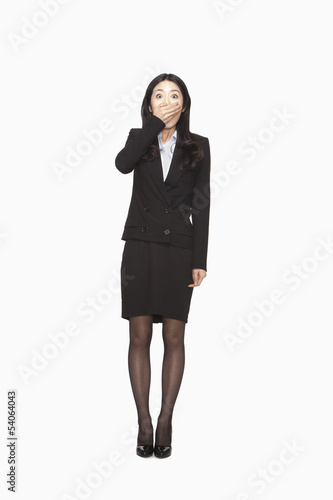 businesswoman, confidence, business, vertical, one person, missy, well-dressed, full suit, long hair, brown hair, standing, excitement, surprise, skirt, high heel, leadership, success, professional occupation, modern, capital city, series, color image, white background, full-length, front view, photo