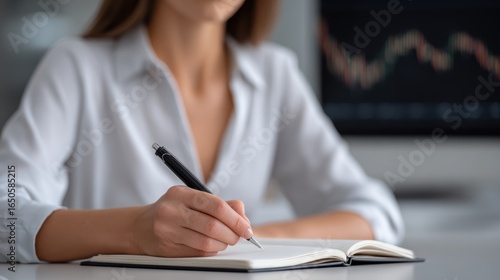Businesswoman, dressed in crisp white shirt, is shown writing. She’s focused, holding pen, taking notes in notebook. Background includes computer screen with stock market data, indicating financial