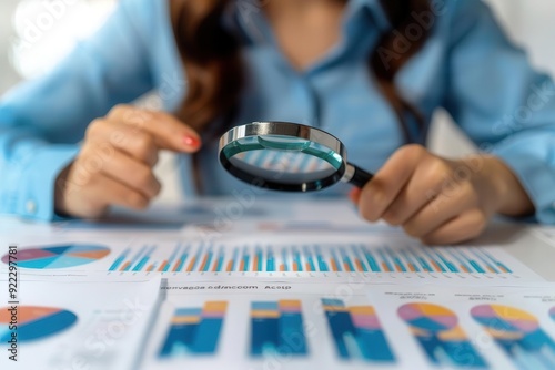 Businesswoman examining detailed analytics reports with magnifying glass, analytics, thorough data inspection