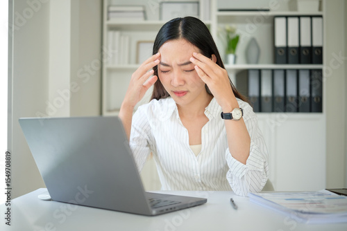Businesswoman experiencing a headache or stress at work, sitting at desk with a laptop and documents.