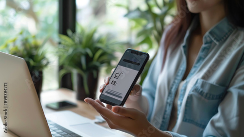 Businesswoman holding phone with text payment successful on screen display.
