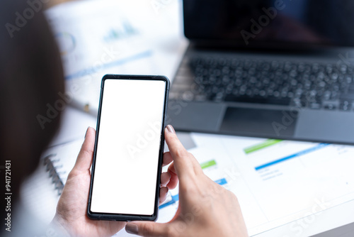 smartphone, business, office, woman, hand, blank, screen, technology, mobile, phone, work, desk, computer, laptop, cyberspace, online, businesswoman, holding, using, display, white, communication, app, digital, connection, message, browsing, searching, application, workspace, corporate, professional, female, entrepreneur, executive, manager, indoor, day, close, up, copy, space, blurred, background, businessperson, datum, device