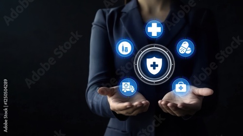 Businesswoman holds health home and car icons with medical cross symbol in hands on dark background, digital healthcare network and first healthcare insurance theme