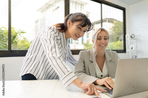Businesswoman is working in office discussion with colleague using laptop computer and wireless technology. Modern woman and coworker teamwork meeting, brainstorming success business strategy.