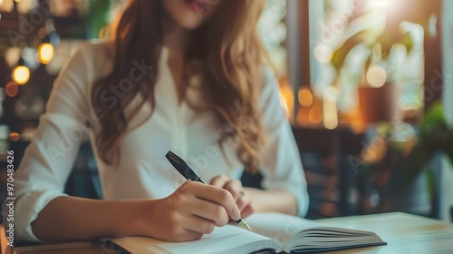 Businesswoman Jotting Down Ideas in a Notebook, Business Theme, Portrait Shot, Simple Background, Notebook