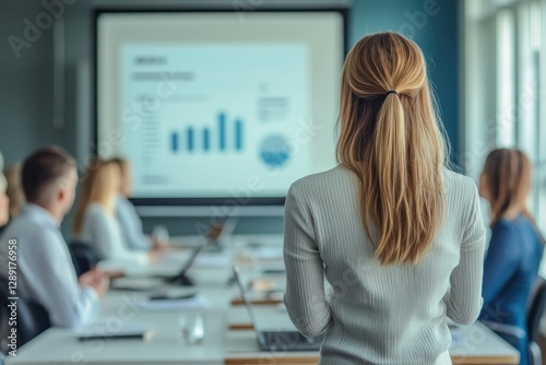 businesswoman, meeting, presentation, projector, screen, chart, graph, office, business, corporate, leadership, executive, team, colleague, analysis, datum, strategy, planning, marketing, finance, sale, growth, success, communication, collaboration, training, seminar, workshop, conference, professional, workplace, technology, modern, blurred background
