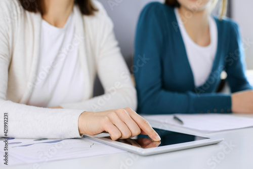 Businesswoman pointing at tablet computer screen while giving presentation to her female colleague. Group of business people working at the desk in office. Teamwork concept