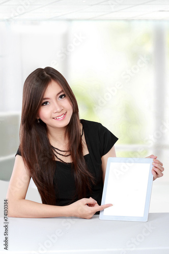 adult, asian, attractive, beautiful, beauty, blank, boss, business, coat, communication, company, computer, confidence, copy space, desk, formal, greeting, happy, monitor, office, people, portrait, professional, profile, screen, self-confidence, showing, to sit, smile, smiling, space, success, suit, tab, tablet, technology, touch, trade, woman, woman, work, men at work, young