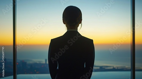 Businesswoman silhouettes idea. A silhouette of a professional looking out over a city at sunset, symbolizing ambition.