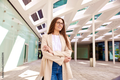 business, businesswoman, woman, woman, walking, street, strolling, city, men at work, secretary, professional occupation, young adult, looking away, happy, smiling, toothy smile, people, person, caucasian, female, lifestyle, beautiful, attractive, brown hair, eyewear, elegant, city life