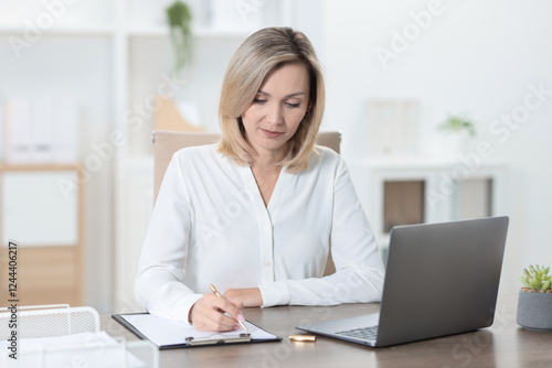 Businesswoman taking notes at table in office
