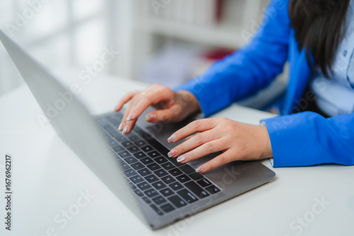 laptop, keyboard, typing, computer, business, office, work, working, businesswoman, woman, female, hand, technology, cyberspace, online, communication, connection, browsing, searching, information, datum, digital, device, workplace, desk, white, bright, modern, professional, career, job, corporate, executive, manager, employee, skill, efficiency, productivity, sharpened, concentration, close, up, detail, blue, suit, blazer, elegant