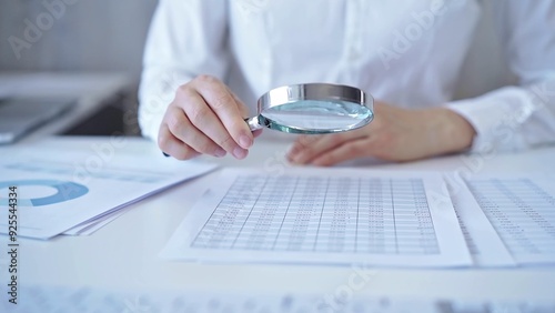business, finance, analysis, datum, magnifying glass, spreadsheet, accountant, accounting, auditing, businesswoman, woman, office, desk, paperwork, document, report, chart, graph, number, research, examining, analysing, investigating, closeup, detail, sharpened, concentration, strategy, planning, budget, investment, table, tax, work, working, writing, inspecting, auditor, white, paper, sitting, using, blue, dress