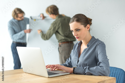 beautiful, signs, sitting, people, male, connection, man, symbol, office, conversation, talk, electronic, working, laptop, work, indoor, discussion, attractive, photogenic, standing, contraption, gesture, gesticulate, showing, meeting, businesswoman, businessman, partner, colleague, flipchart, brainstorm, selective focus, young adult, wireless technology, wooden table, caucasian woman