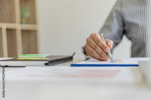 Businesswoman's hand holding a pen pointing at a bar chart on a corporate financial information sheet, the businesswoman examines the financial information provided by the finance department.
