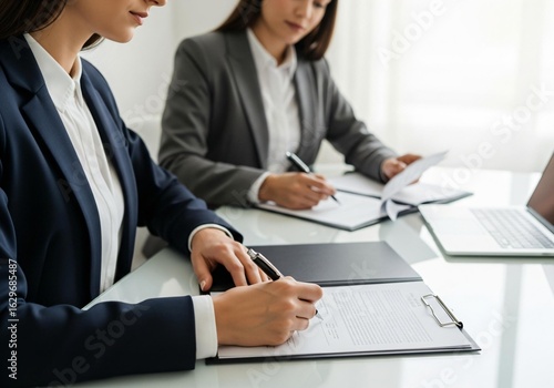 Businesswomen diligently signing documents in modern office