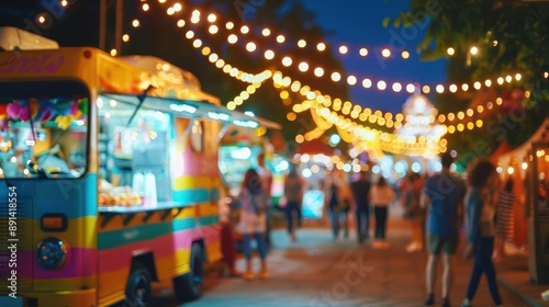 bustling city festival with colorful food truck in foreground string lights and excited crowd in soft focus background creating warm and inviting urban nightlife scene